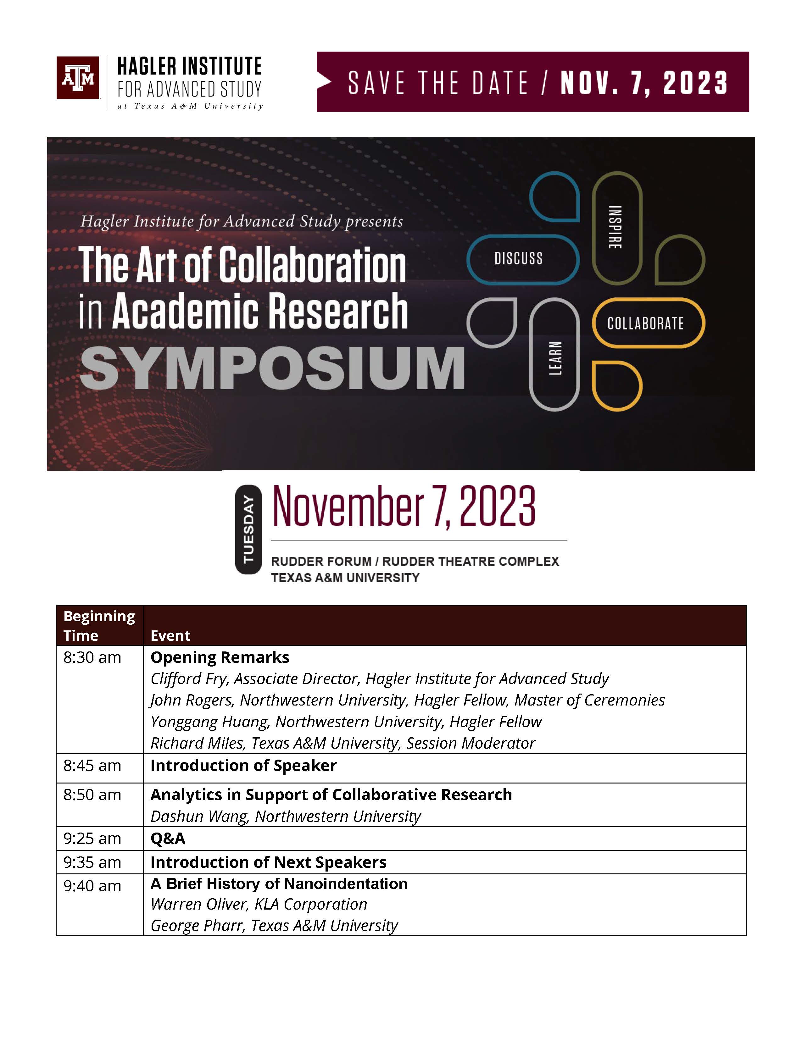 The Hagler Institute for Advanced Study invites you to attend the “Art of Collaboration in Academic Research” Symposium to be held on November 7, 2023 in Rudder Forum. The symposium promises to be a powerful and inspiring event, where some of the most accomplished researchers in science and engineering discuss the importance of collaboration, with specific examples from their own careers. Speakers will include Hagler Fellows Drs. John Rogers and Yonggang Huang in addition to other collaborators from Texas A&M and universities across the country.
