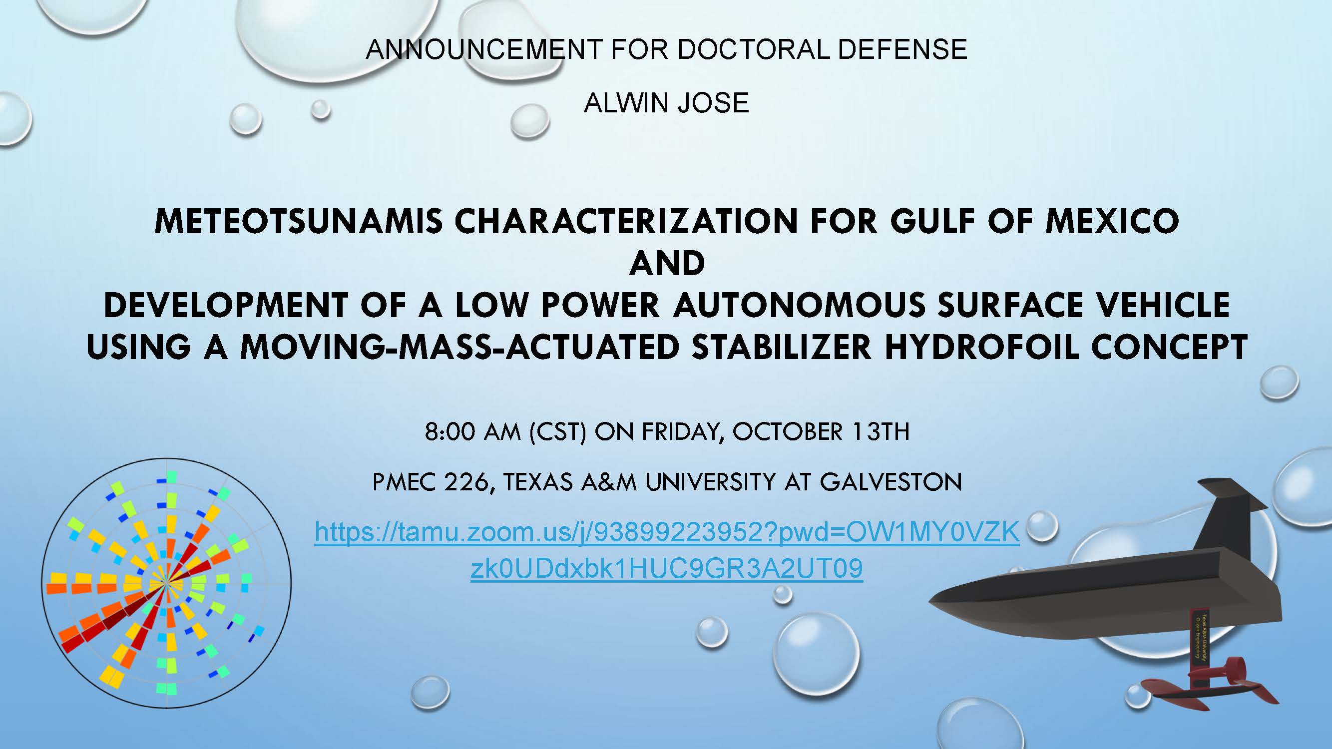 A Meteotsunamis characterization for Gulf of Mexico and development of a low power autonomous surface vehicle using a moving-mass-actuated stabilizer hydrofoil concept. 8:00 am CST on Friday, October 13th PEMC 226, Texas A&M University at Galveston. Unable to attend? Click here: Zoom : Doctoral Defense Alwin Jose