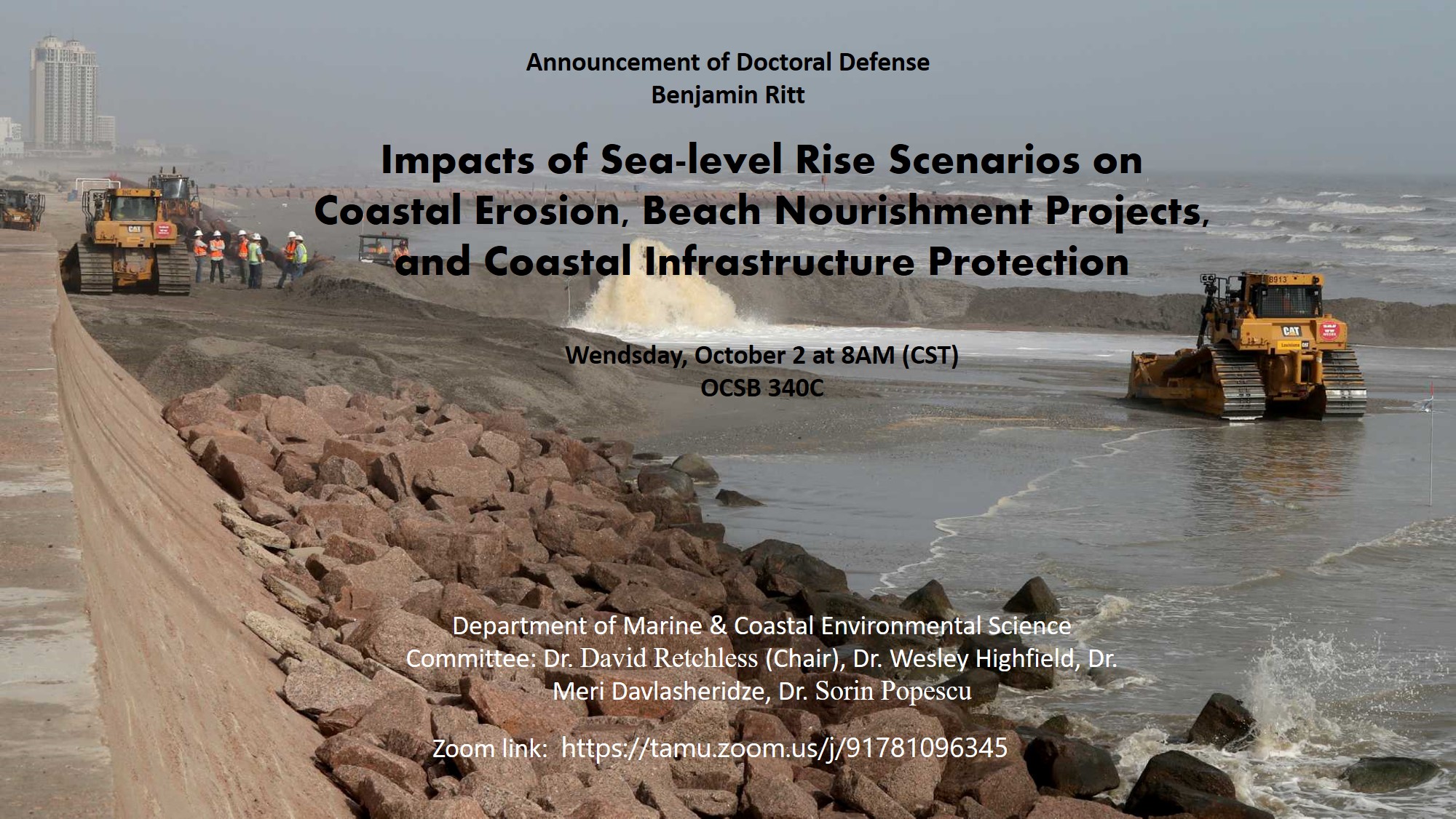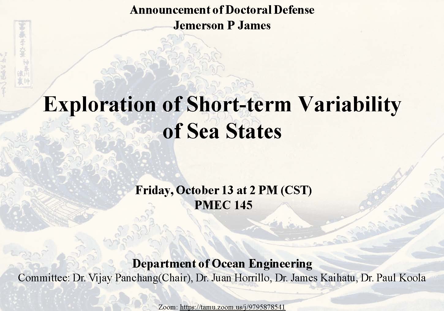 Exploration of Short-term Variability of Sea States Friday, October 13 at 2 PM (CST) PMEC 145, Texas A&M University at Galveston. Unable to attend? Click here: Zoom : Doctoral Defense Jemerson P. James