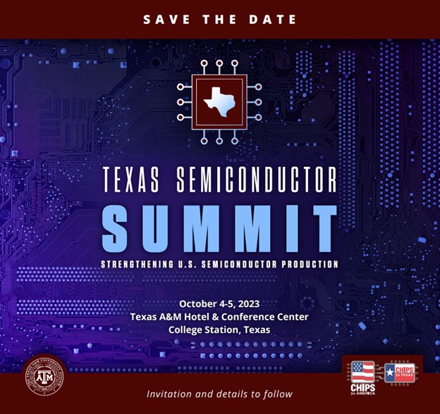 The Texas Semiconductor Summit will be held October 4-5, 2023 at Texas A&M Hotel and Conference Center College Station, Texas.