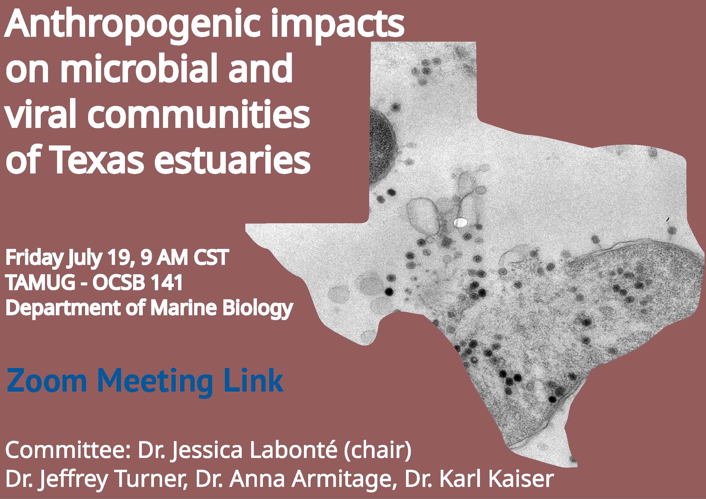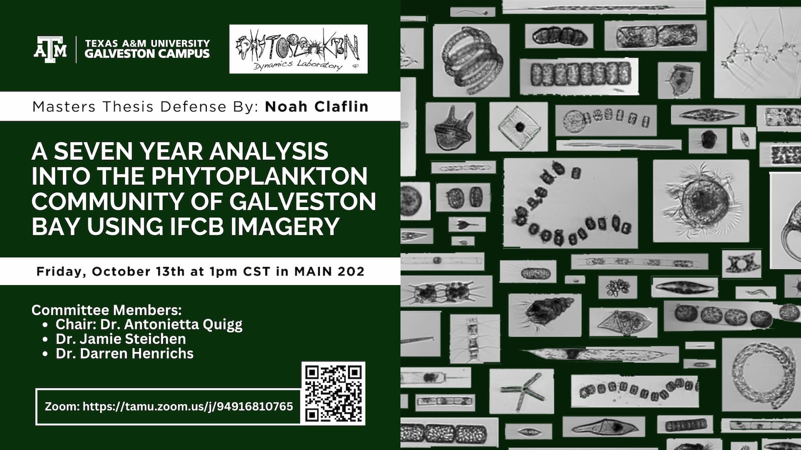 A seven year analysis into the phytoplankton community of Galveston Bay using IFCB imagery. Friday October 13 at 1:00pm Main 202. Unable to attend in person? Click here: Zoom: Masters Thesis Defense Noah Claflin