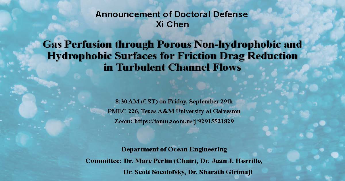 Gas Perfusion through Porous Non hydrophobic and Hydrophobic Surfaces for Friction Drag Reduction in Turbulent Channel Flows. 8:30 AM (CST) on Friday, September 29th PMEC 226, Texas A&M University at Galveston. Unable to attend? Click here: Zoom: Doctoral Defense Xi Chen