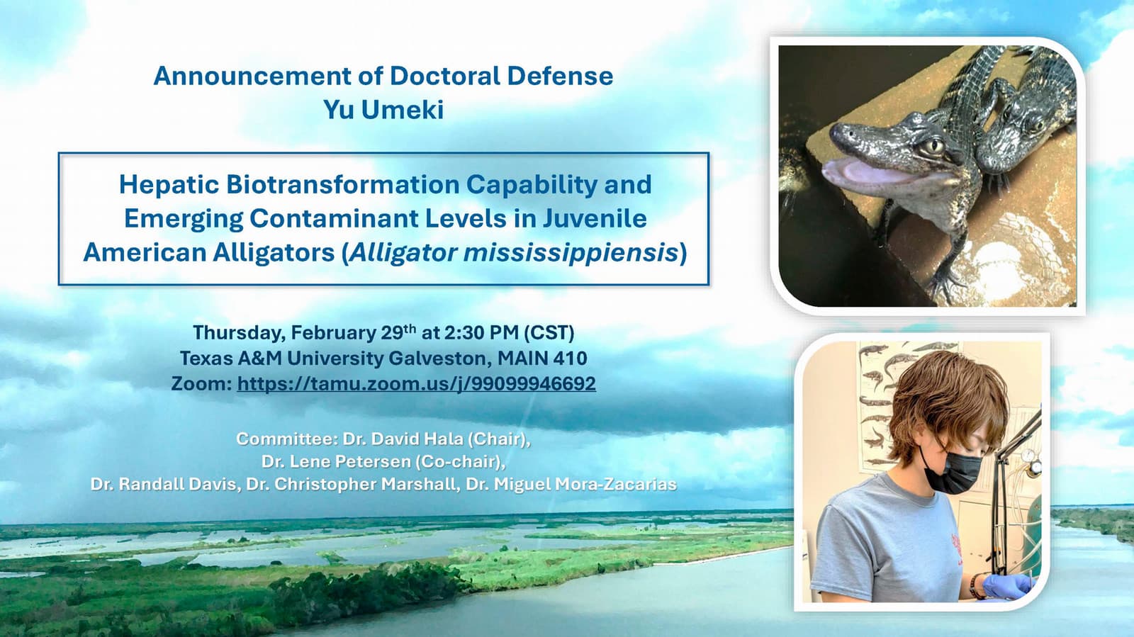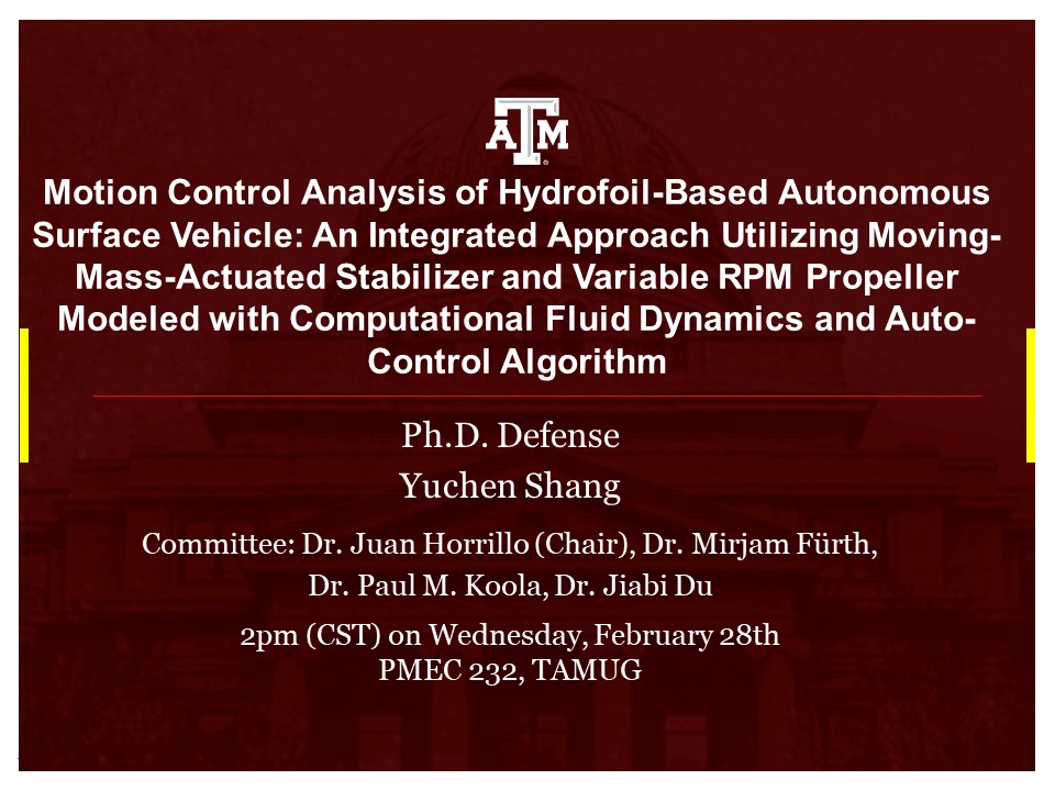 Thursday, February 29th at 2:30 PM (CST)Texas A&M University Galveston, MAIN 410. Unable to attend? Click here to join by ZOOM of Doctoral Defense Yuchen Shang