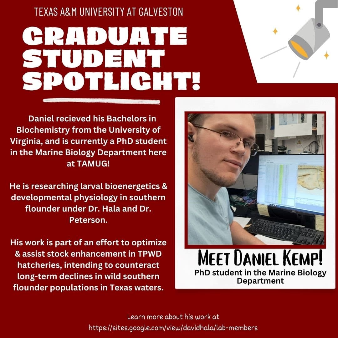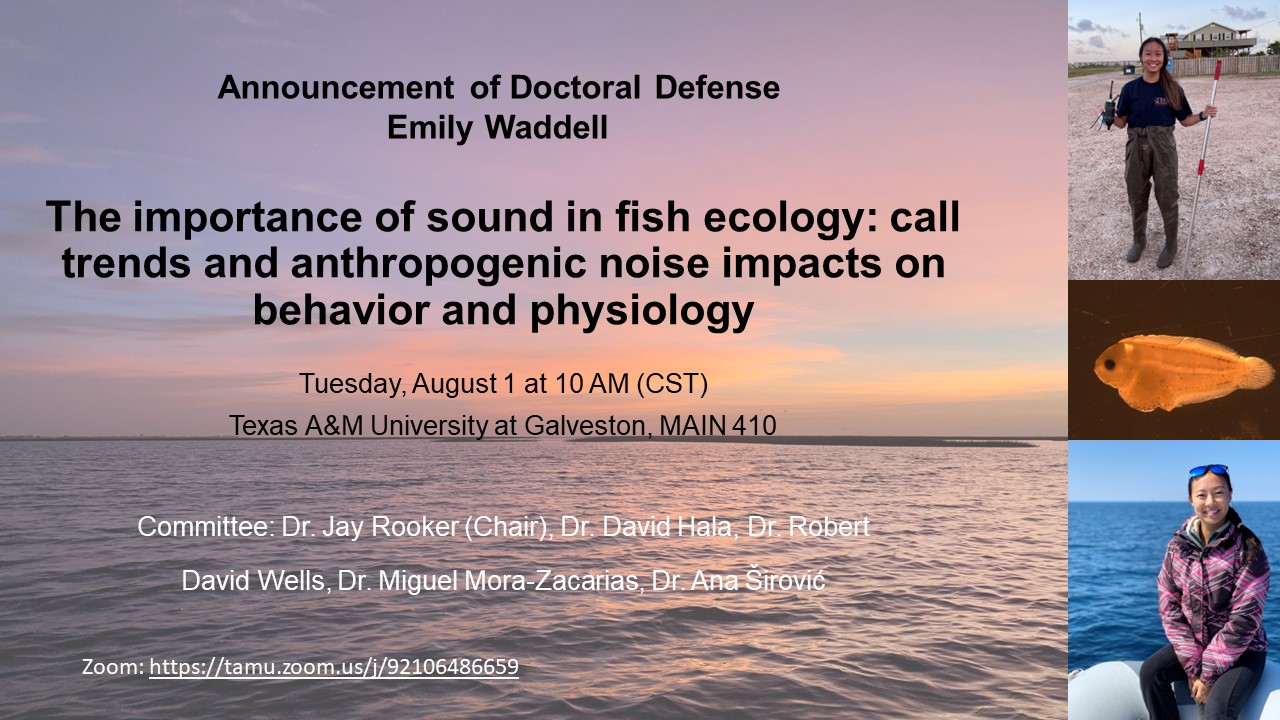 The importance of sound in fish ecology: call trends and anthropogenic noise impacts on behavior and physiology. Tuesday, August 1 at 10 AM (CST) Texas A&M University at Galveston, MAIN 410. Unable to attend? Zoom Link: The Announcement of Doctoral Defense Emily Waddell