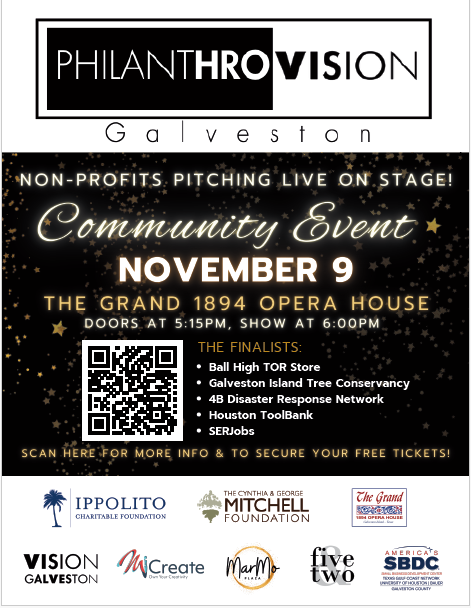 Philanthropitch+ Vision Galveston was conducted in 2022 as a new program to the Island to support Galveston based nonprofits or nonprofits that were looking to scale to Galveston. In 2023, Vision Galveston will be proudly conducting the program PhilanthroVision Galveston as an all-local event. The PhilanthroVision Galveston program rallies together nonprofit organizations, corporations, foundations and business leaders to support out-of-the-box solutions to some of Galveston’s toughest problems. We are proud to work alongside nonprofit organizations, corporations, foundations, and business leaders on our Island or those who wish to bring programs to Galveston to create sustainable and scalable impact.