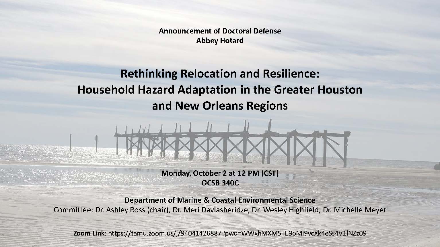 Rethinking Relocation and Resilience: Household Hazard Adaptation in the Greater Houston and New Orleans Regions. Monday, October 2 at 12 PM (CST) OCSB 340C. Unable to attend? Click here: Zoom: Doctoral Defense Abbey Hotard