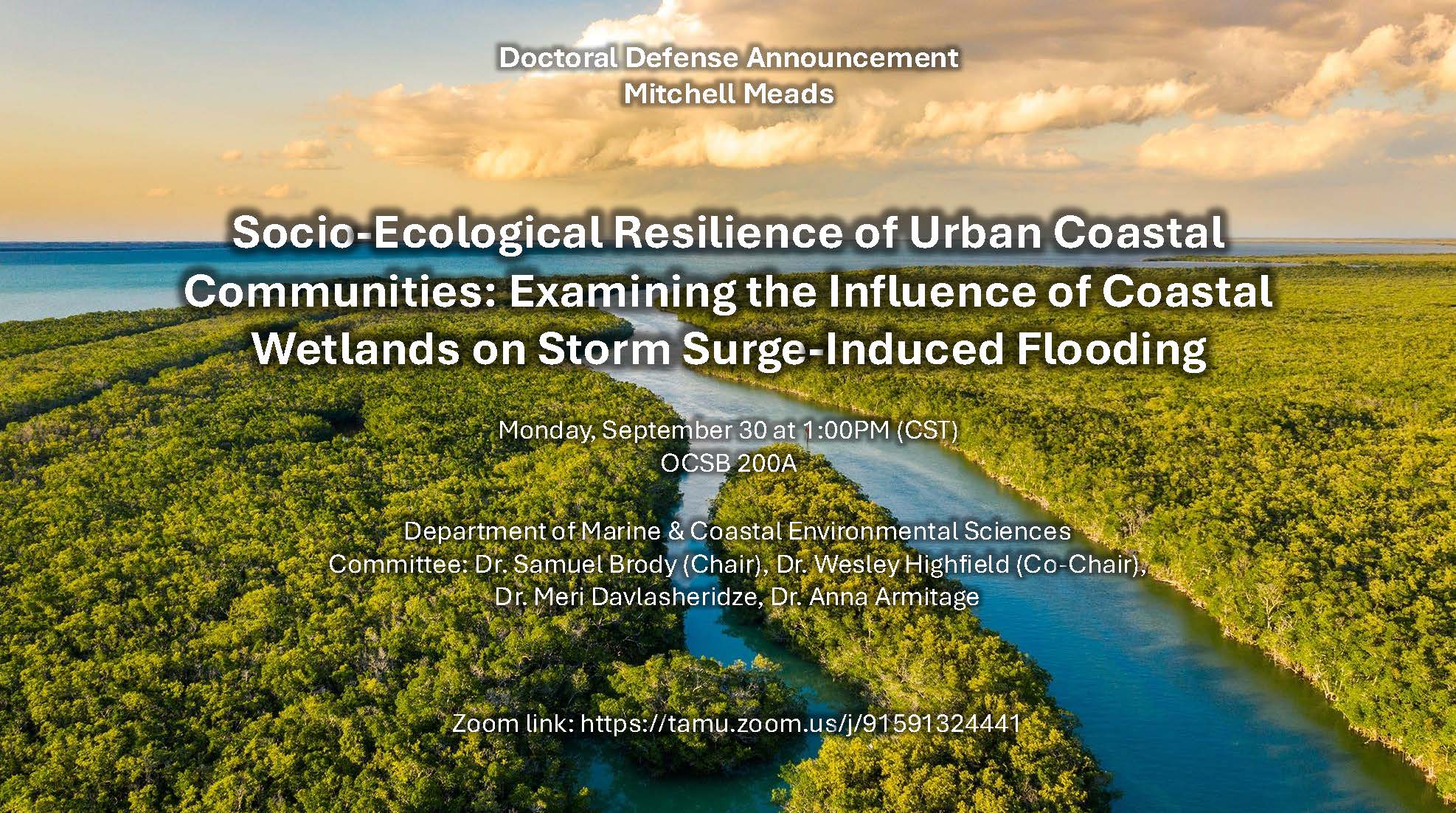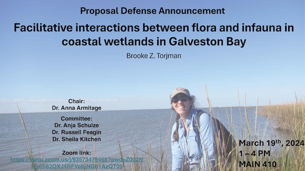 Proposal Defense Announcement: Facilitative interactions between flora and infauna in coastal wetlands in Galveston Bay March 19 1:00pm-4:00pm Main 410. Unable to attend? Click here to join by Zoom.