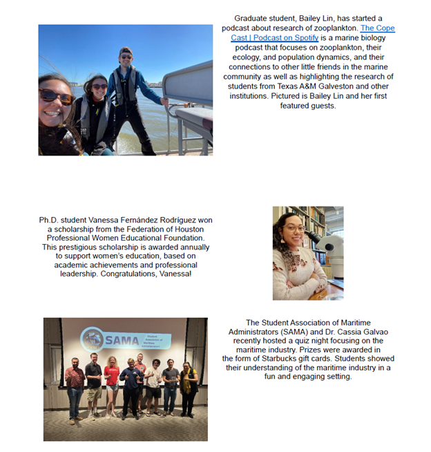 To strengthen and advance Texas A&M University at Galveston’s current efforts in the blue economy arena and position the university to advance societal impact, submit winning proposals to the state, federal agencies, and the private sector, and garner support from foundations interested in supporting oceans and the environment. Create opportunities for workforce development and contribute to the economic growth and well-being of those on the island and its surrounding communities. Click here to Register!