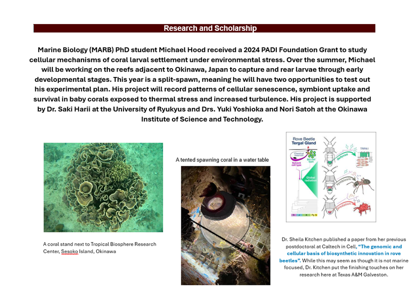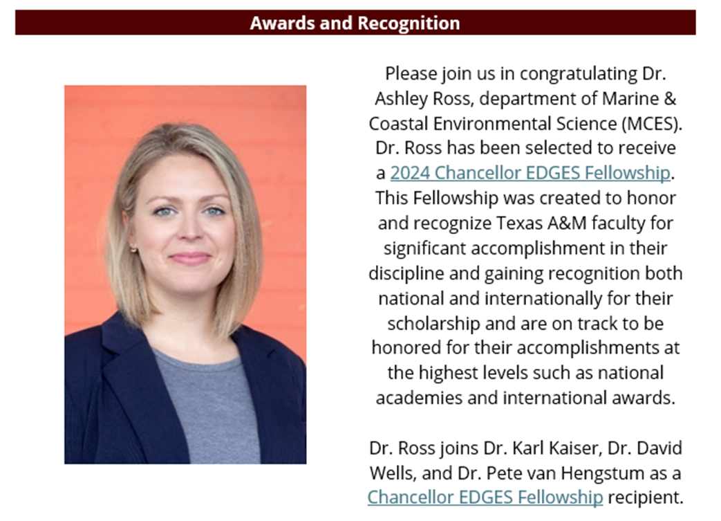 Incoming Marine Biology Doctoral Student, Ansley Levine (advisor: Dr. Anna Armitage), is the first recipient of the Doctoral Research Excellence Assistantships provided by the Office of the Chancellor. The intent of this award is to bolster the research at Texas A&M University. To read more about this award, click here. Congrats Ansley and Dr. Armitage!