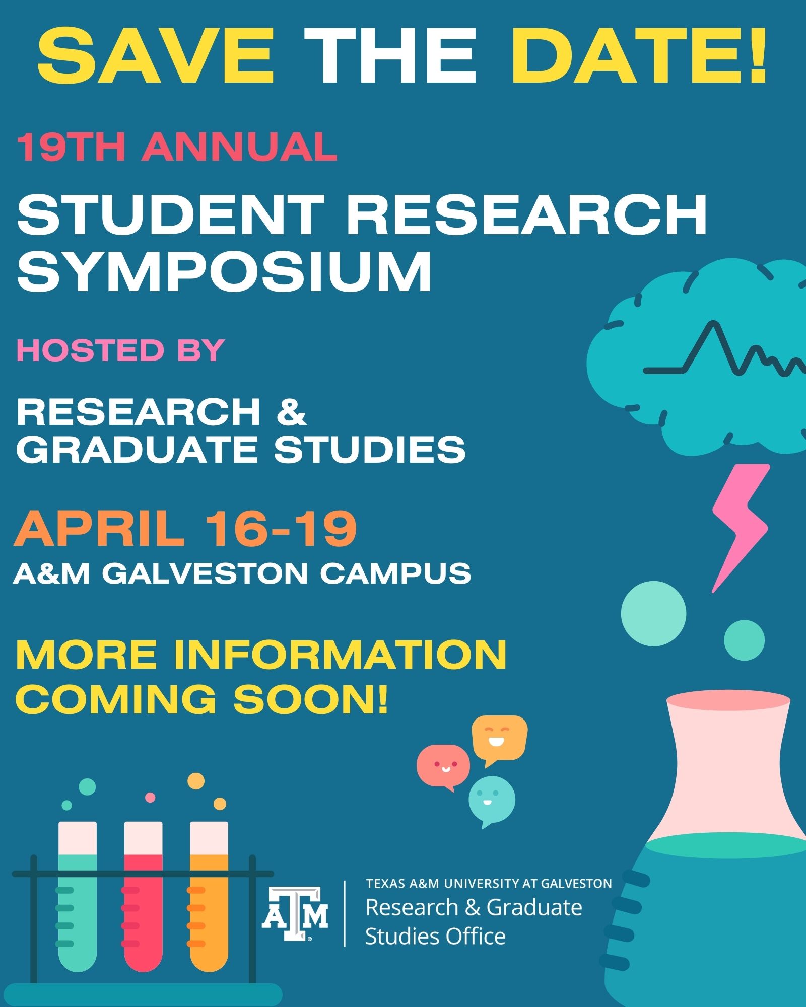 Texas A&M University at Galveston (TAMUG) presents an Annual Student Research Symposium, April 16-18, 2024. The Symposium is open to all TAMUG students. Participants are encouraged to present preliminary findings or results from their current research projects. Presentations will provide students the opportunity to share their research with other participants, staff, and faculty. In addition, the Symposium provides a venue for the exposure of student research to the broader TAMUG community. Register Here!