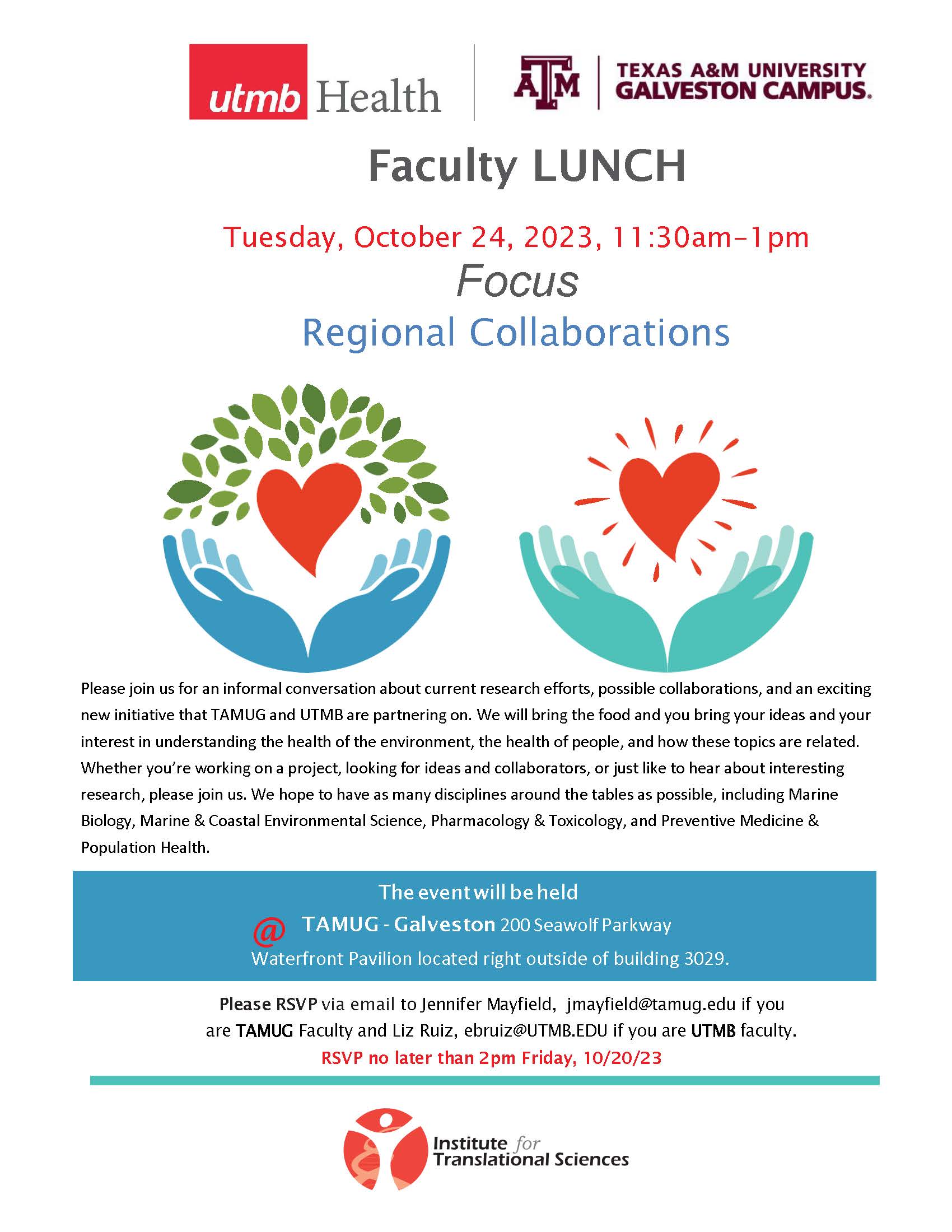 Join Texas A&M University at Galveston and UTMB for a faculty luncheon Tuesday October 24, 11:30-1:00pm located on TAMUG campus at the Waterfront Pavilion, RSVP by Friday 10/20.