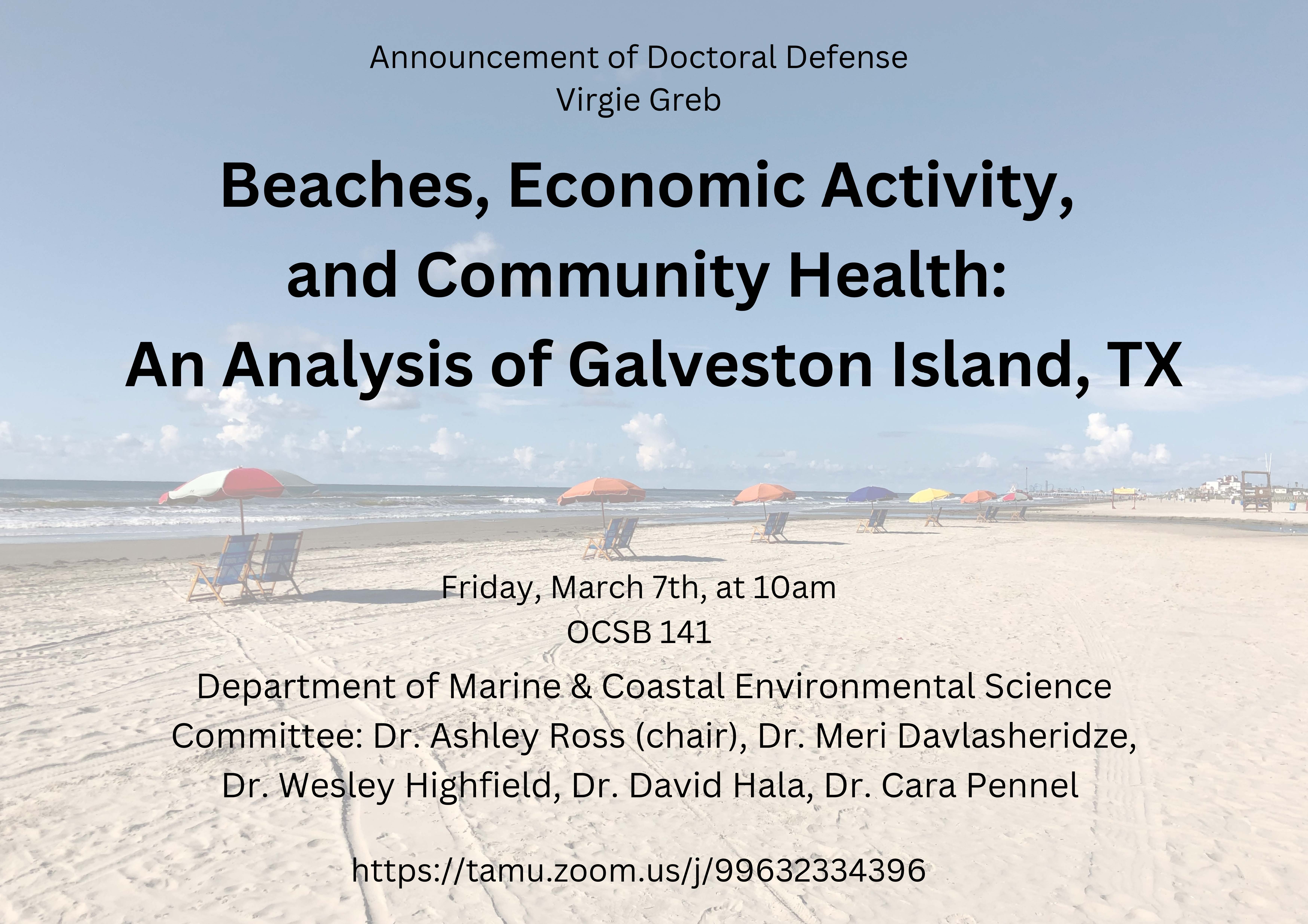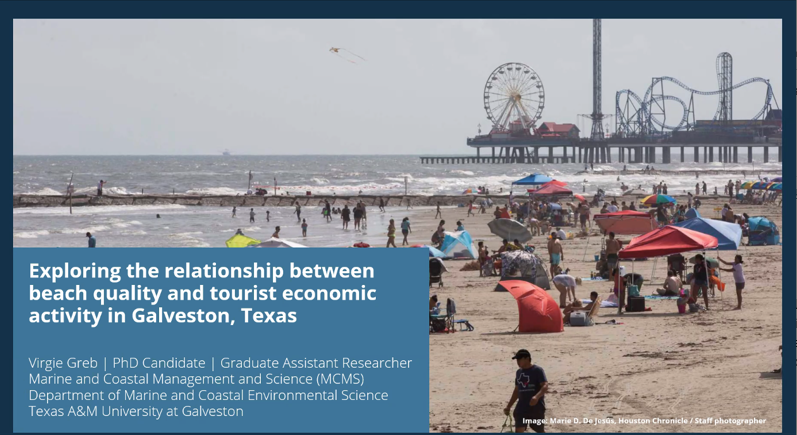 Virgie Greb, Doctoral Candidate in the Marine and Coastal Management and Science program, gave a talk for the Clean Coast Texas Lunch and Learn series. She presented her research “Exploring the relationship between beach quality and tourist economic activity in Galveston, Texas” to 74 attendees, including officials from the Texas General Land Office and other state, regional, and local entities. Greb’s dissertation work examines the associations between beach water quality, economic benefits of coastal resources, and public health.