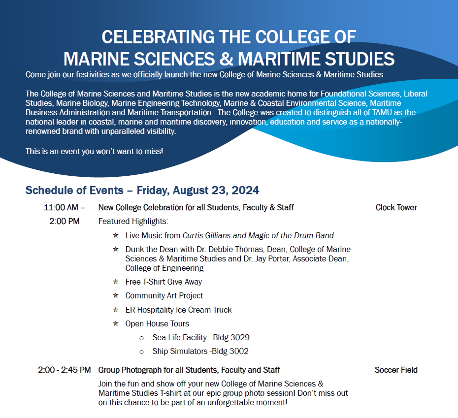 Today marks an exciting milestone for Texas A&M University at Galveston with the launch of the new Texas A&M College of Marine Sciences and Maritime Studies! Whoop!